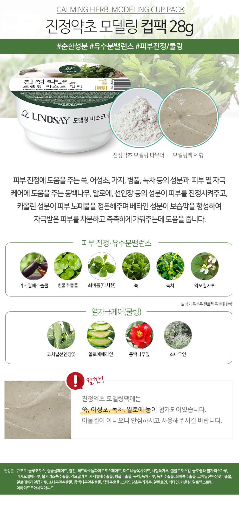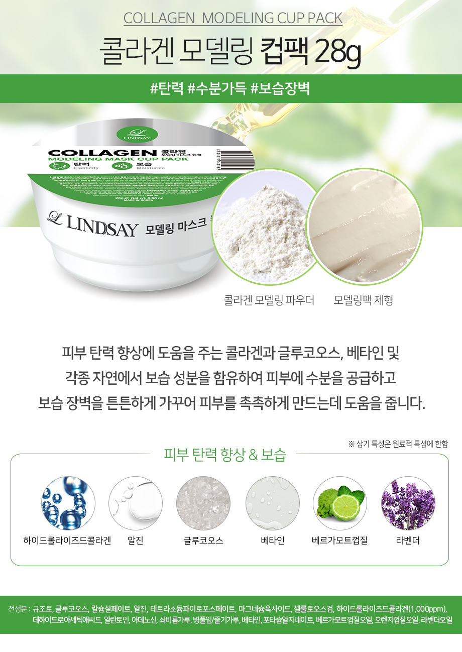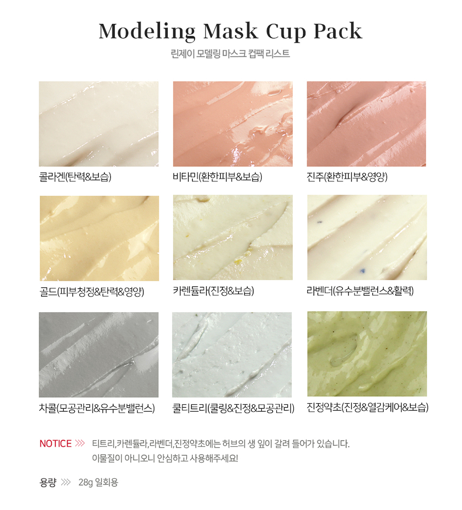 Collagen(綠)--改善皮膚彈性並滋潤皮膚 Cool Vitamin(橙)--亮麗肌膚與營養 Calendula(黃)--舒緩並滋潤敏感肌膚 Lavender(紫)--皮膚油脂和水分管理(平衡)和舒緩 Charcorl(黑)--皮脂吸收/去除/毛孔管理 Cool Tea-Tree(藍)--熱刺激護理(冷卻)&保濕&舒緩 Calming Herb(深綠)--舒緩肌膚,平衡油水