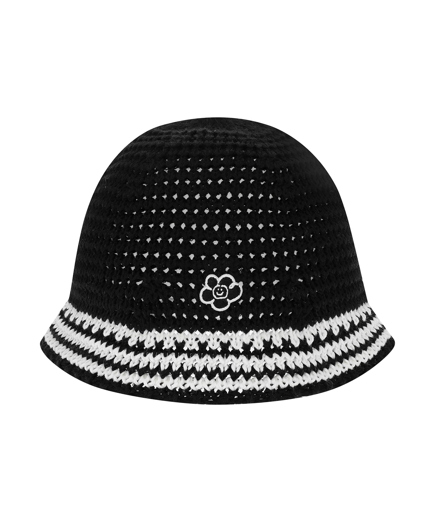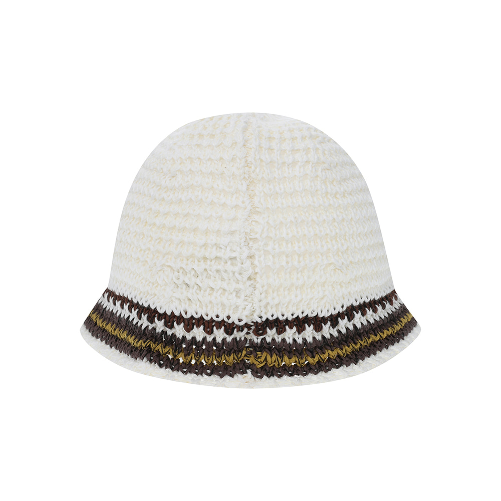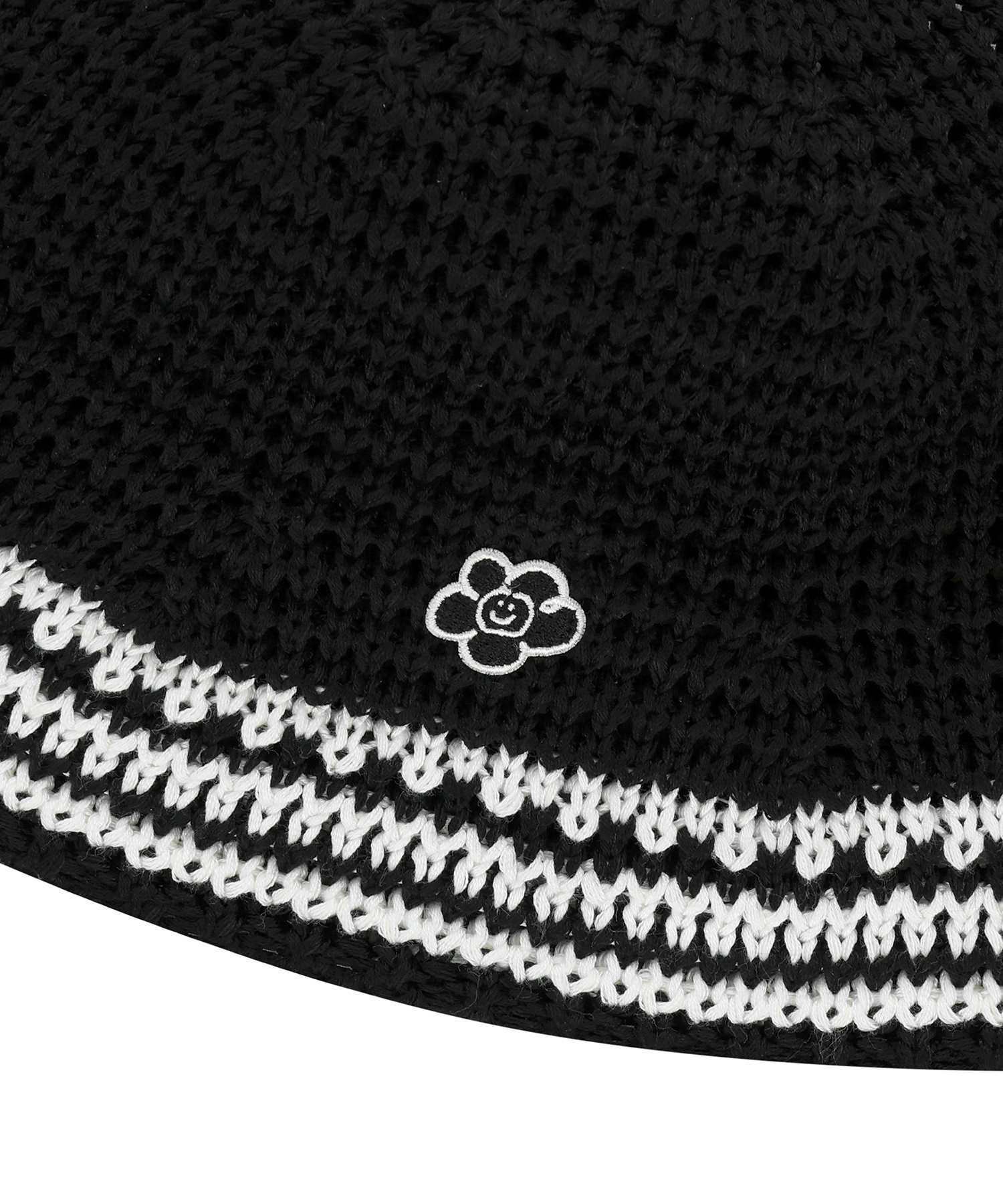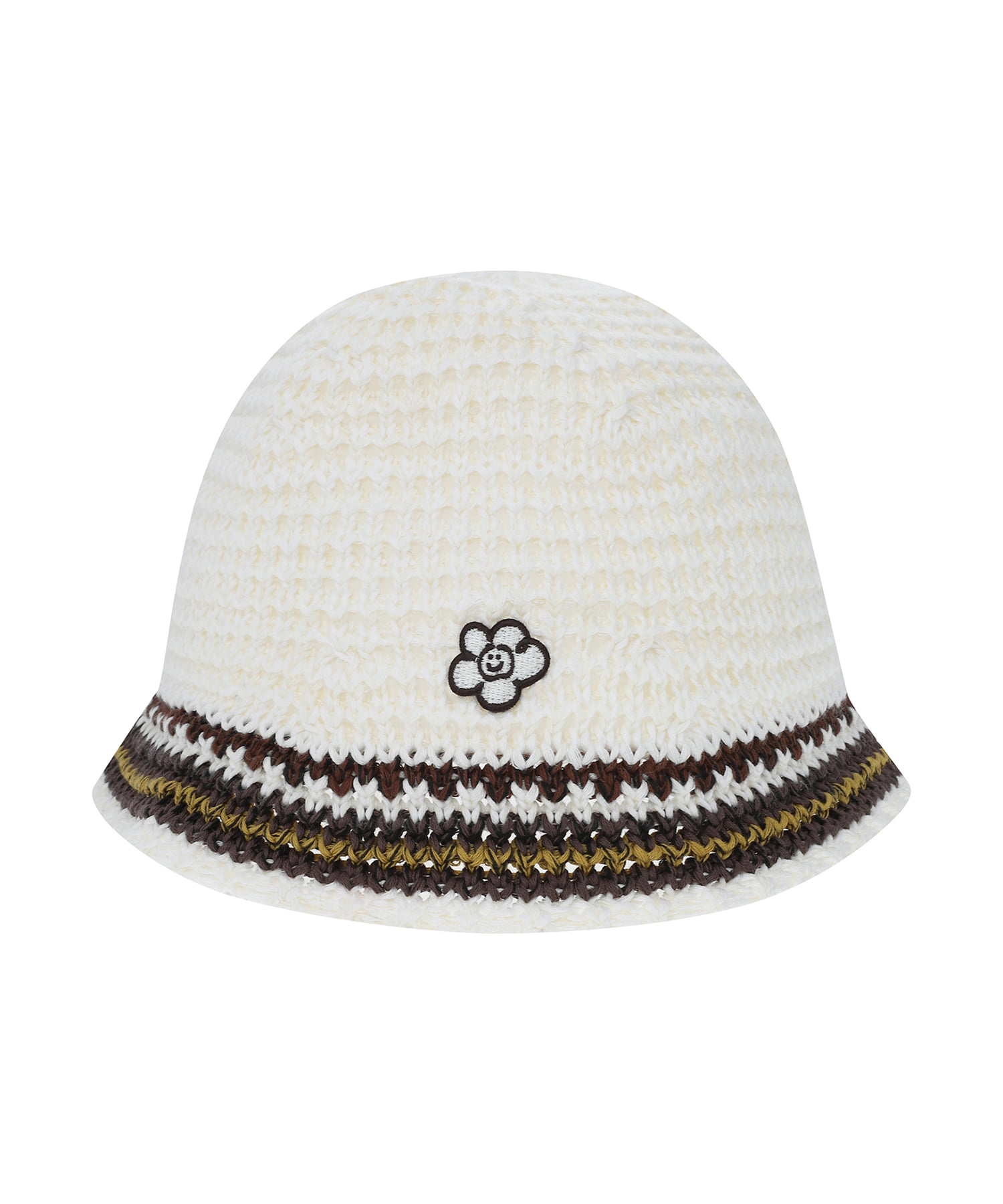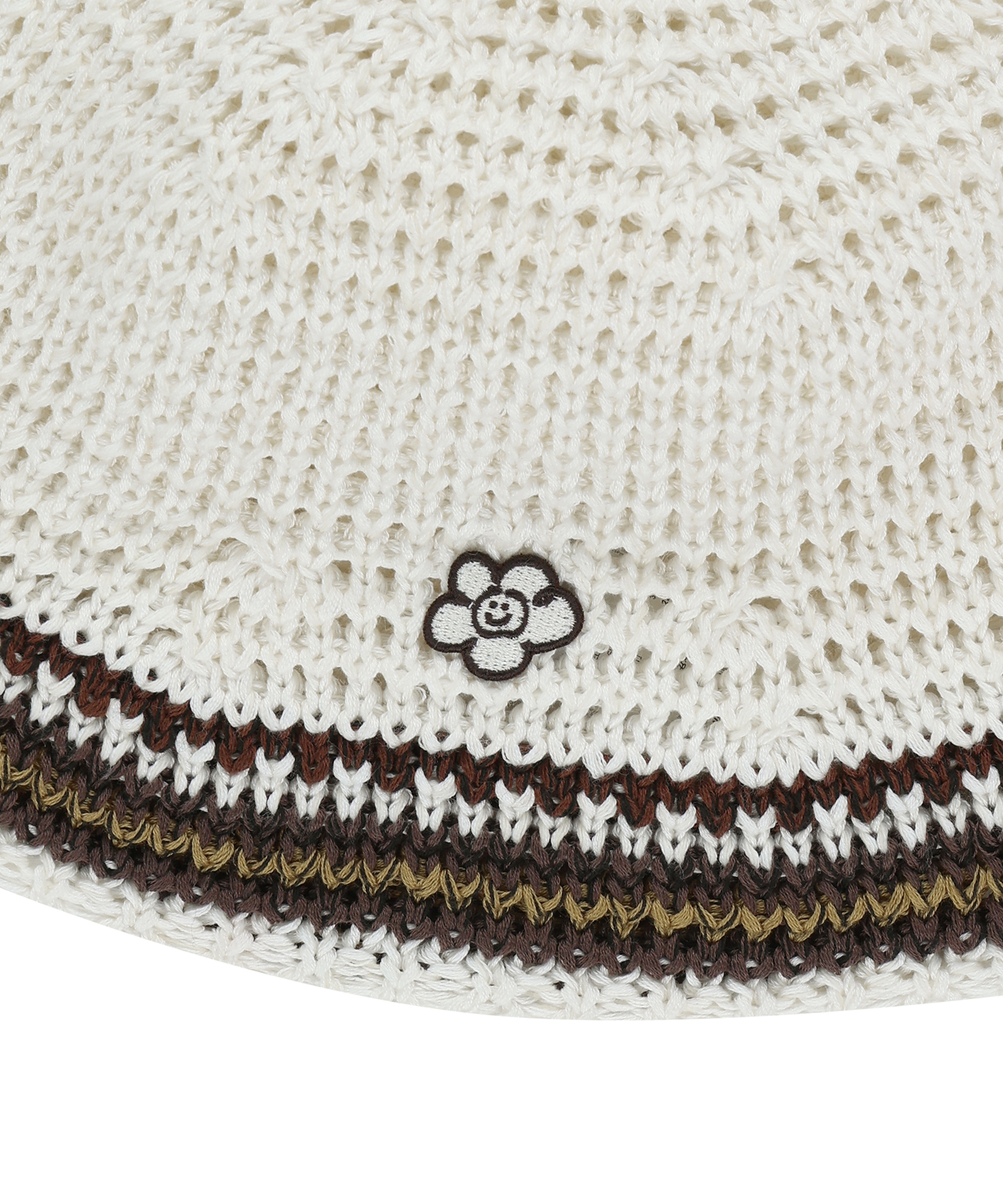~圓頂形針織漁夫帽,具有透氣針織質感。 ~帽簷採用自然色彩組合設計 ~正面花卉刺繡旗幟點